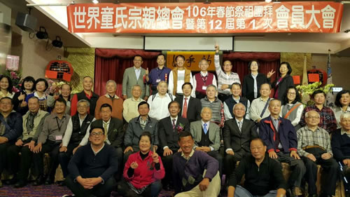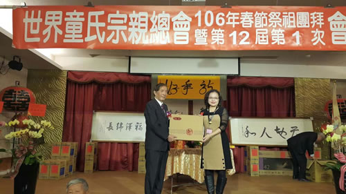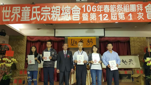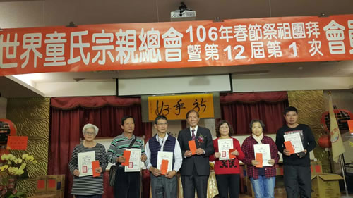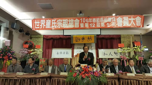 2017年2月19日,台湾世界童氏宗亲总会在台中举办33周年庆典。全台各县市约500位宗亲参加,席开50桌。会议进行了第十二届理事监事选举,表扬了会务贡献的宗亲,为国小至大专宗亲提供了奖学金,发放了80岁老人慰问金。