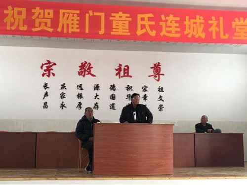 2017年1月16日,雁门连城童氏礼堂落成,由连城理事会理事长,监事会主任联席会组织连城各公房宗亲梓叔代表召开全体理事成员代表会议。会议内容有:一、连城礼堂观摩礼堂落成成果,二、听取理事会2016年以前的工作汇报,三、研究和布置理事会下步工作思路等。