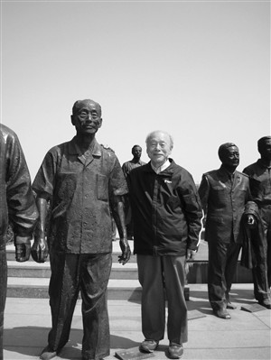童志鹏在院士林与自己的雕像合影 通讯员 范世清 供图