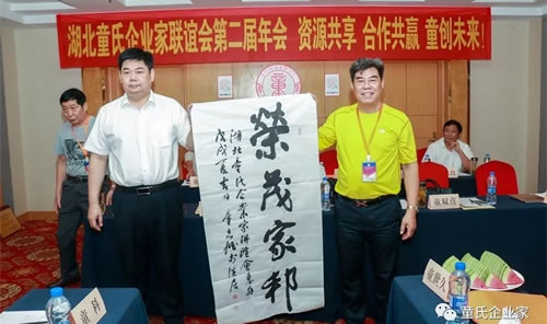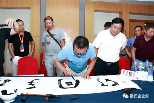湖北恩施童氏企业宗亲会秘书长、书法家童辉先生为宗亲泼墨献宝:童氏一家亲,携手同行,家和万事兴。著名书法家童志雄先生莅临会场,为湖北童氏企业家联谊会敬献墨宝。