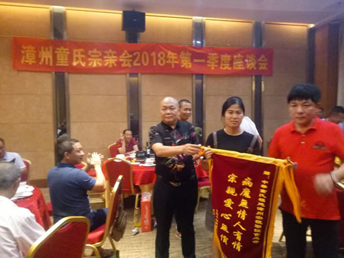 漳州童氏宗亲联谊会曾为本会会员童丽萍的父亲童银肚因大病无钱医疗筹集善款,其家属趁此机会送来旌旗。