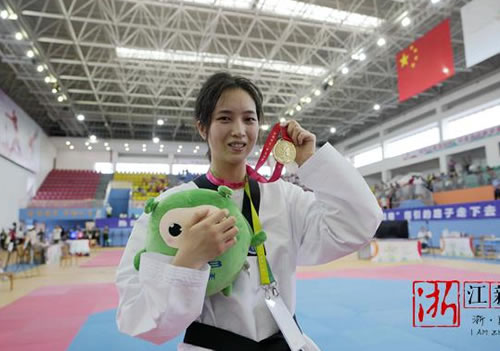 在南浔宏达学校体育馆举行的跆拳道女子甲组62公斤级的比赛中,湖州选手童晓宇以62:6的悬殊比分击败对手,摘下本届省运会开幕式后的首枚金牌。