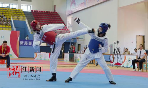 下午3点45分,省运会跆拳道比赛迎来了女子甲组62公斤级决赛。对阵双方是湖州市代表队的童晓宇和金华市代表队的林淑婷。