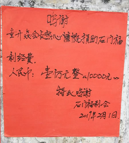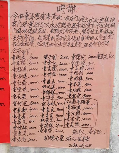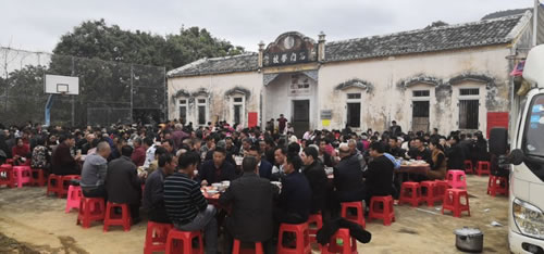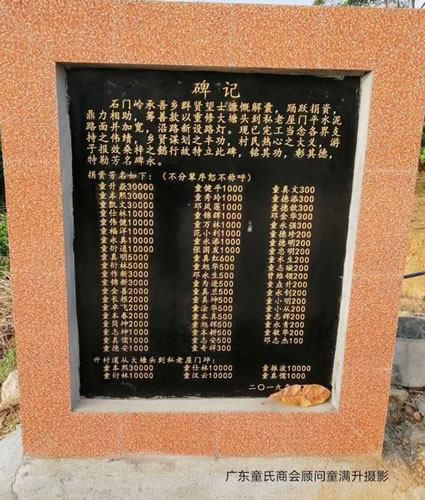 石门岭这里村民友善团结、和睦相处,多年来,在童升焱等宗亲的无私奉献和带领下,不但兄弟们发家致富,而且在修路、修葺学校、祠堂等一系列公益事业上争先恐后,蔚然成风,成果显著。 石门岭村里最近一次集资赞助修路,下图是大家赞助修缮的村中路面、石门学校与童氏祠堂,全村在家村民春节大聚会。