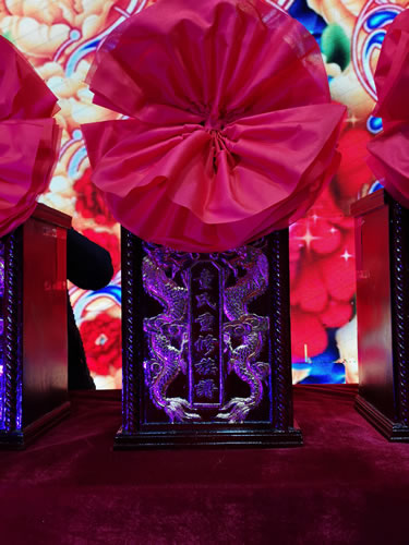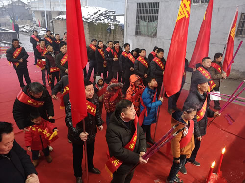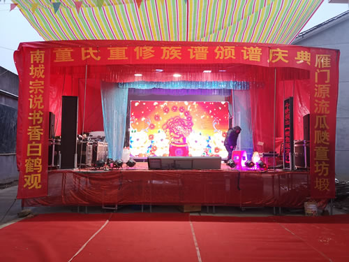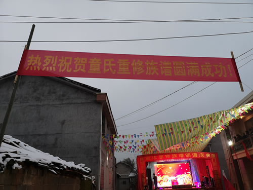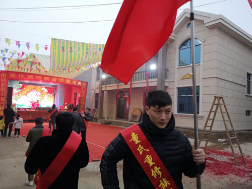 下午四点前往圆谱地沙陂村,那红红地毯铺满了整个会场,一连几道为圆谱而搭设的门楼,喜气洋溢,其楹联内容适时适事。