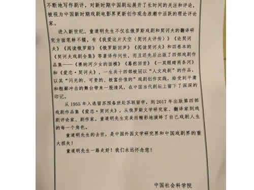 追悼会由八宝山殡仪馆主持。10点整,身着制服的礼宾将宗长遗体从后堂移到追悼会大厅,期间由中国社会科学院外国文学研究所所长追悼致辞,总结介绍了童道明老师的一生。