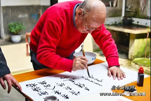 谈及家乡建设,童老翘起大姆指。乡情意浓,他当场题字赠送志愿者。“大师级的画家如此平易近人!”围观者连声称赞道。