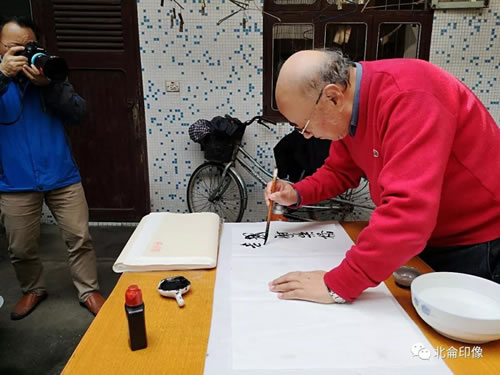“童老夫妇应柴桥老乡诚邀,去了老家,並叩谒了其出生地。泼墨挥毫,送与活动参与者。实令人感动。回程中,参观了北仑声像志愿团队大本营。文唅闻讯赶來。他对志愿者一路行來的成就,大加赞赏!並说,简直不可想像矣!”--钟序元