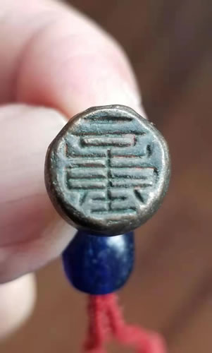 此枚"童"印章是我众多收藏品中的一件心仪之物,平时用丝带所系佩带于身,但并非作为签約、盖章之用,而是作为童姓后人,有幸于二千多年后偶得此方印章,缘份哪!我平日将此宝物佩带于身,闲时摩挲把玩之余,思绪穿越时空,联想千年之前先祖日常用印理事之景,浮想连翩,其乐融融,不由得使我更加缅怀先祖先宗,掛此印于身,避邪压胜,不亦乐乎!