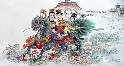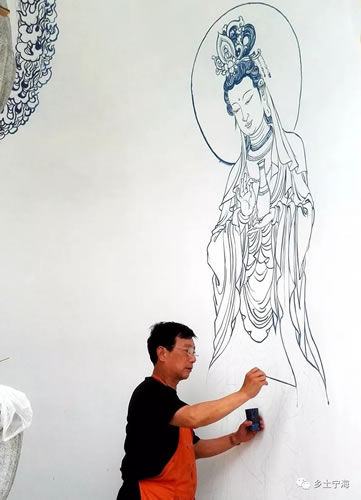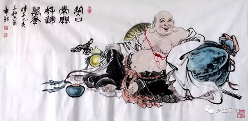 童帝新,1947年生,宁海前童人,辛亥革命志士童保喧将军嫡孙。八十年代初,童帝新去藏区22年,在寺院留下大量佛像唐卡等作品,曾获“浙江省首届艺术人才”称号。藏区归来,他研究彩墨画。其作品《中华颂》荣获宁波市金奖和最高人气奖。他工于雕刻,擅长绘画,是一位著名的乡土画家,也是改革开放后汉人画师入藏绘制唐卡第一批人才。