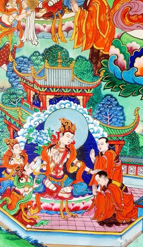 童帝新的工作,就是带着徒弟和师傅们,在这些寺庙里雕塑佛像,绘制唐卡和壁画。唐卡是藏族悬挂供奉的宗教卷轴画,多为佛像和宗教故事,用明丽的色彩描绘佛的世界。唐卡和重彩唐卡都有着复杂的绘制要求,童帝新认真学习研究,画艺也精湛起来,渐渐得到大家的认可和尊重。