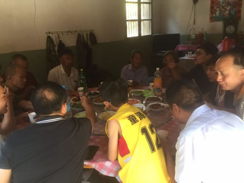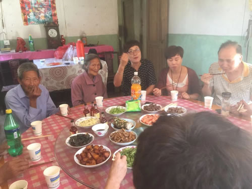 上午十时左右,到了村口,家长太公的儿子们己候在村口迎接了。家长太公年已九十有三,仍神釆奕奕,满脸笑容,很是高兴。我们将备带的礼品、红包呈递太公、太娘,以表示全体族人的一片敬意。太公一家都感到无比欣慰,也很客气地设中餐款待宗亲,菜肴丰盛,现制手工面条,柔绵味美,回味无穷。席间六代族人同桌,太公清淅地传述了上童山事迹,晩辈们个个向太公敬酒,亲情气氛浓浓。祝愿太公俩老颐养天年、寿比南山、福如东海!