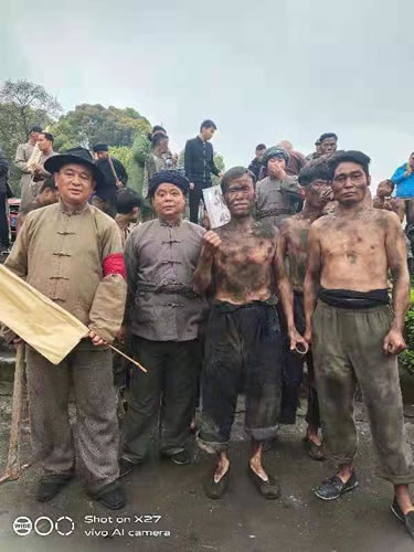 第四档 28 个人中有十多人光膀子,进进出出,反复的试拍。导演、工作人员为 了拍摄一个好段子,反复咔嚓咔嚓,一直拍了三个多小时。我们这些碳古佬跟毛主席、刘少奇、李立三等特型演员同框上镜。