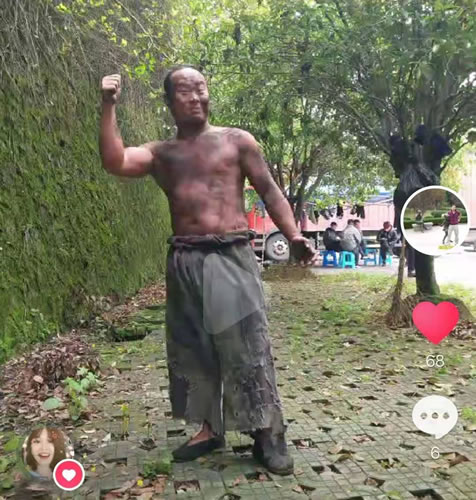 到了 10:00 左右指导又挑了近 30 个年轻力壮的小伙子拍摄,此时我被选中。脱衣光膀化妆,画成一个碳古佬。老天真不带劲,那么冷的天,比往日温度要低好几度,好像是老天也在帮着做现场,让人无意识的体现当年那个场景。那个冷啊,冷啊,冷啊! 画呀画呀画呀!一拔人搞到 11:00 才开拍摄镜头。