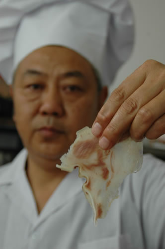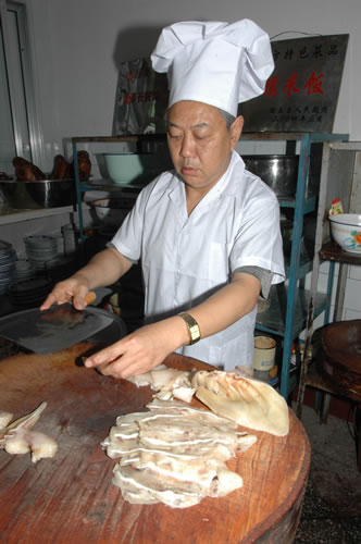 童邦修的“片”功 “薄” 让人惊叹。不过他说,要“片”好还要选好煮好肉。他虽有绝技,可凉拌猪耳朵销给普通顾客时,最多只片六七厘米长,因为这样食用要方便一些,就是这样,顾客也觉得这凉拌猪耳朵非同一般。