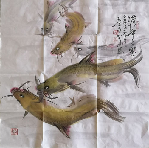 在恩施年会现场,由于现场条件所限。其在其他宗亲创作后才开始献爱心。只见其双手将宣纸缓缓展开,手掌略往右侧轻捋,提画笔略加沉思,在脑中构思着作品的布局。在一番思考之后,便是一气呵成,一笔挥就。一幅栩栩如生的淮王鱼跃然纸上,条条神采各异。周边响起阵阵掌声与叫好声,在现场掀起一个高潮。此时的他,悄悄的退至休息处,轻轻的按摩着腰椎,而后呷了一口茶,坐在那凝视着什么。