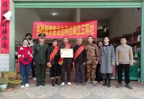 3月2日,连城县为童龙志同志在部队荣立三等功的现役军人家庭送去立功喜报,县委、县政府相关领导负责人参加活动。