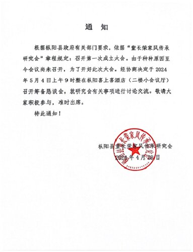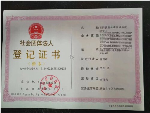 枞阳县童长荣家风传承研究会于2023年9月1日由枞阳县民政局批准成立,准予登记的批复文件号:枞民【2023】102号(2023年8月29日发文)。业务主管单位为枞阳县文化和旅游局。有效期五年。