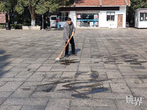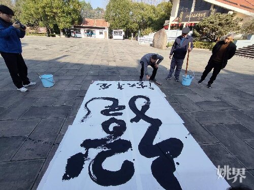 阳光明媚,春意盎然。2月19日上午,在河姆渡遗址博物馆的广场上,一位耄耋老人以地面为纸、清水为墨,手握巨笔,挥毫泼墨,书写着不同字体的“龙”字。他就是为“龙”痴迷的书画爱好者——童岳年。