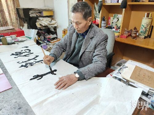 说起为何专注写“龙”?童岳年告诉记者,虽然他生肖不属“龙”,却好“龙”,喜欢收集关于“龙”的事物。特别是退休后,他重拾儿时书画爱好,到老年大学参加专业培训,又求教书画名家,广览历代名帖,心摹手追。童岳年曾在余姚龙泉山西麓广场练习八尺整张“龙”字榜书时,赢得了现场观众的喝彩。当时,余姚电视台专门录制了节目,播出后反应热烈。自此以后,他萌发了专注写“龙”的想法。