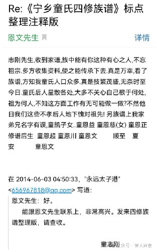 2013年初,我从族人童亚兵处得到《宁乡企石冈四修族谱》影印电子版,开始做一些研究和记录,并陆续在博客上发布。不久后,恩文先生看到了我的帖文并与我取得联系,当得知我们同属宁乡童氏一族的时候,大家的兴奋之情溢于言表。