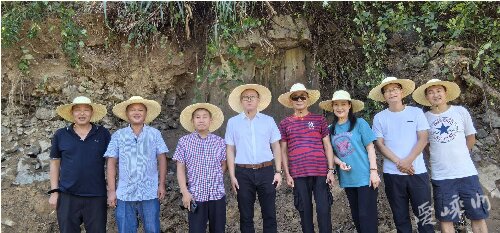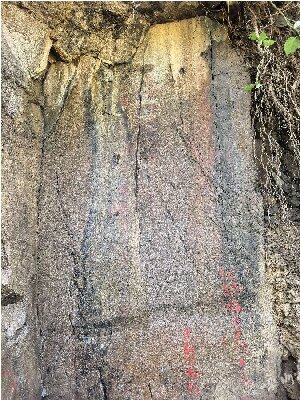 民国《嵊县志》只记载“护龙刻石”在“游谢乡红字岩”,但未明详细方位。23日的成功挖掘,印证了上巅村[注7]童元中先生及村老的回忆和判断,即红字岩就在上巅村双溪港口路边,45年前修马路时,被挖掘下来的泥石所掩盖。他清晰地记得有村老曾亲口讲起红字岩上刻有“护龙”斗方大字,雨后字体泛红,故有红字岩之谓。