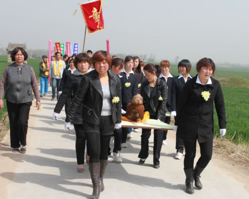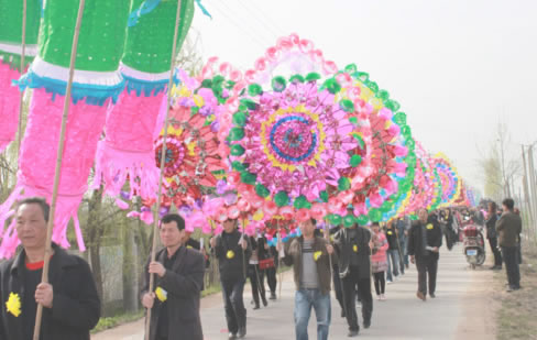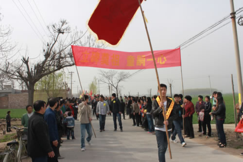 阿底村童氏打着童姓大旗在村西公路迎接长安区栗子新村童氏族人祭奠队伍