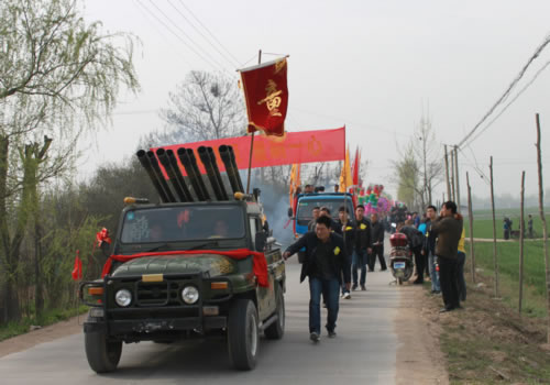 栗子新村祭奠队伍在炮车的引导下进入阿底村祭奠广场