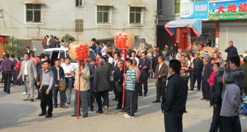 福建永定县现有童姓人口四千人左右,分布五个乡镇七个自然村。从二00七年成立理事会后决定从二0一0年起,每年春季祭开基祖坦庵公,由始祖所生四个儿子即现在的四个房裔孙轮流主持。主持村可邀请其村迁往外地的梓叔参加,各村组织人员一同参加。现正商议五年一大祭,即从永定各房迁出的宗亲,祭祖日全部集中统一参加祭祖,日期由主持村选定,一般在春明前。