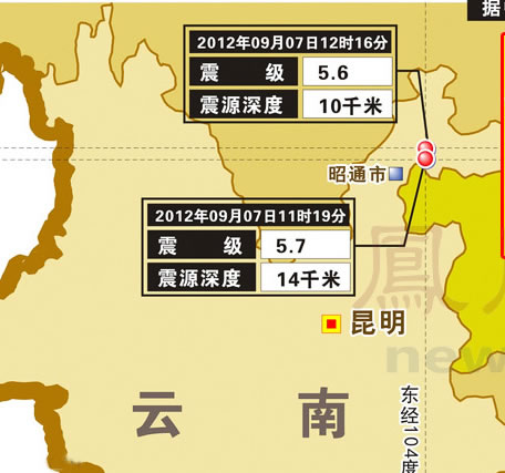 据中国地震台网测定,北京时间9月7日11时19分,在云南省昭通市彝良县、贵州省毕节市威宁彝族回族苗族自治县交界发生5.7级地震,震源深度14公里。随后的12时16分,在云南省昭通市彝良县发生5.6级地震,震源深度10公里。成都、重庆等地震感明显。