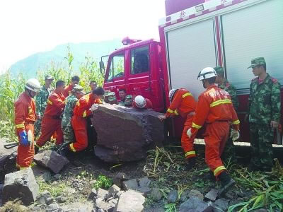 在震中洛泽河镇,救援官兵在移开阻挡道路的落石