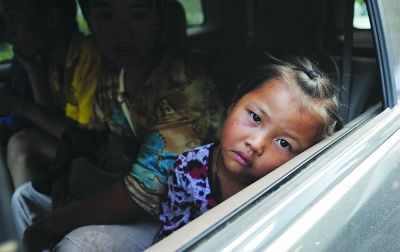 在彝良县重灾区洛泽河镇,数名小女孩在等待转移