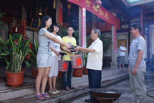 2012年高考,义乌稠西童裔又有11名子弟收到了新生入学通知书。开学前,父母带领他们到义乌蒋母塘童大宗祠祭祖。义乌童氏宗亲会长者为他们发放纪念品。