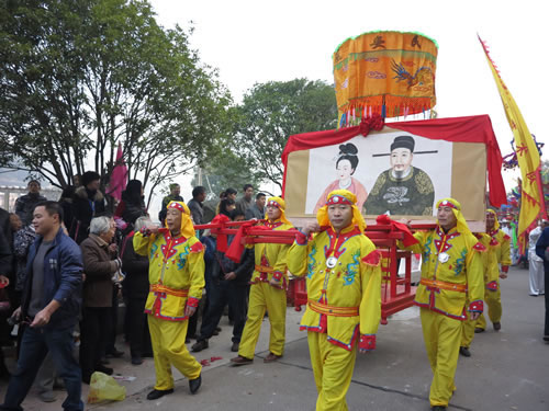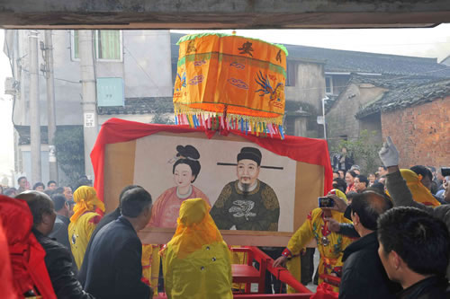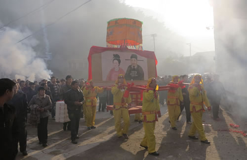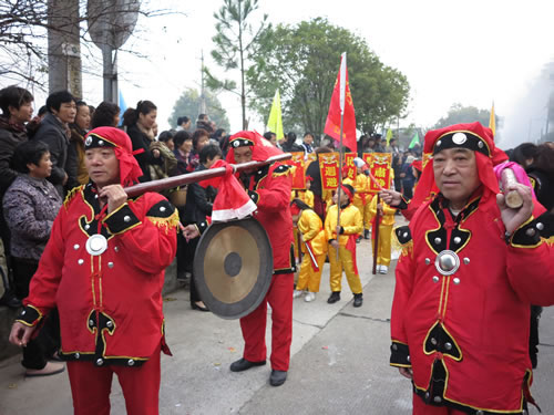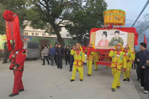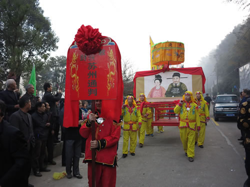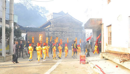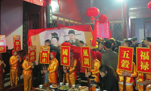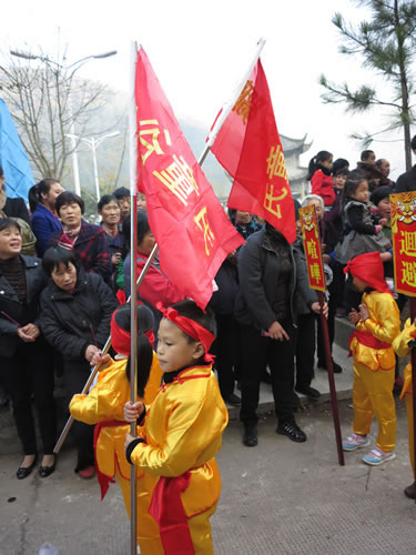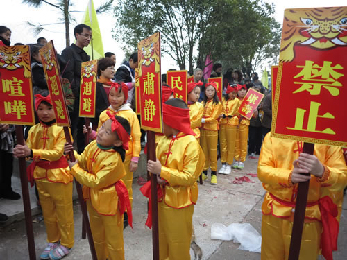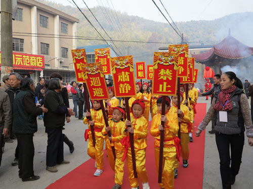 童氏裔孙迎着 “禁止 喧哗 肃静 回避” 等标牌