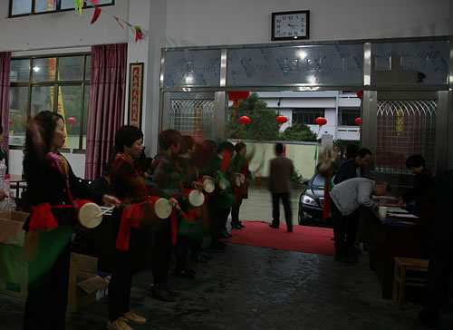 避开欢迎的腰鼓队,悄悄地“溜”进会场-----不事张扬