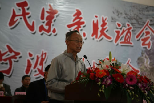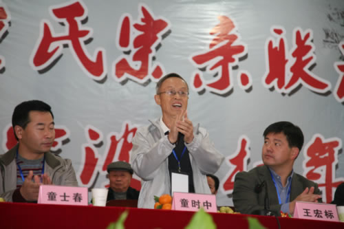 在浙江宗亲会童村年会主席台上向全体宗亲致意