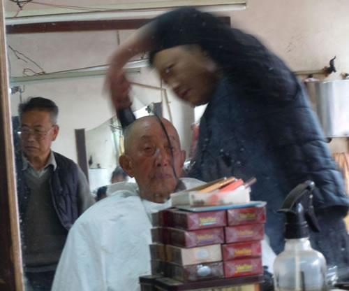 童光基(90岁)半躺在那旧得不能再旧的理发椅上,由店主的儿子在理着发。我从镜中看了看他,点了点头、笑了笑,算是打招呼。