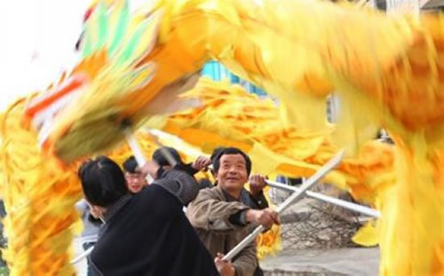 黄色的长龙贯穿活动场地,在舞蹈《开门红》的配合下,长龙舞动,热闹的表演赢得了村民的阵阵掌声。“为了演出,我们排练了近两个月,人家是挑灯夜读,我们可是挑灯舞龙。”舞龙队队员郑新洪打趣道,除了下雪的时候没有排练,两个月期间舞龙队的11位队员无人请假,就是为了将表演做好,而舞蹈《开门红》则寓意着村民的日子越来越红火。