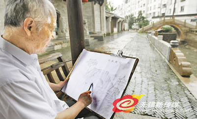 8月11日,79岁的老人童伯清带著画板来到惠山古镇。趁著丝丝的细雨,老人开始用手中的画笔绘起了古镇。老人表示,画古镇是自己最大的爱好,而当天的细雨更让惠山古镇成了一幅动人的水墨画。(付斯博摄)