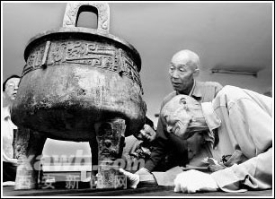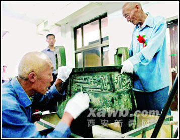 照片说明:童玉乾、童怀义抚摸着青铜鼎,健在的两位岐山老人感慨万分。
