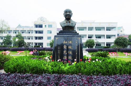 女埠信义小学校园内的童崇基铜像。时宽兵摄