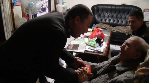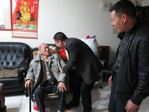 义乌宗亲会的童昌云副会长拿出一个早已准备好的红包,要送给他,老人使劲地一再拒绝,直到我们说,这是义乌童大宗祠给老哥拜年的,老人才慢慢地收下了。