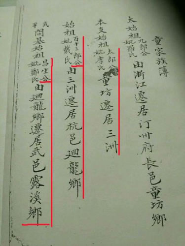 据台湾童振荣宗亲提供四川万载童氏谱手抄本资料及永定县童长良宗亲所提供永定大园村资料(见下图)显示,童太郎公由长汀童坊迁居三洲,至百十三郎公迁往上杭回龙乡(今上杭县官庄畲族乡回龙村),再传至昌生公前往武平鲁溪(即今鲁溪始迁祖)。