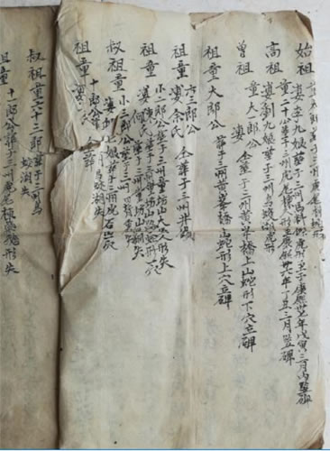 8月5日寻亲第一站,前往四川资阳地区的乐至县佛星镇寻找宗亲童远福。童远福拿出了珍藏298年的《童氏家谱》手抄本(清朝康熙59年)。下午前往武胜县鼓匠乡七里半村的童上全老人处,经过座谈交流,童上全老人拿出一本武胜县礼安镇越江村的《童氏家谱》。