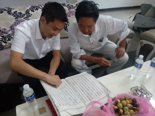 进屋,一大桌水果摆放在那,但是大家的心情都不在这上面,首先就是谈了迁徒过程以及始祖的姓名,二边都把家谱拿出来放在一起,你看我的,我看你的,大家都异口同声的说,终于找到了,谱头一模一样,就连字数都一样的,今天了了我们的最大心愿。