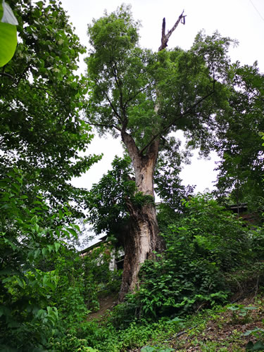 在他们家门口还有一棵古树,我叫不出来,遮天蔽日,绿叶葱翠,在树身上寄生了一棵大叶榕,大家啧啧称奇。