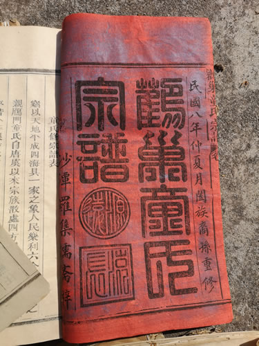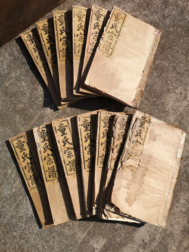 热情的宗亲迎接我们的到来,拿出新谱,搬出老谱。不看不知道,看了吓一跳。那老谱,一般都只有上一次修的老谱,没有想到在此却看到了三套保存完好的老谱。他们分别是民国八年(1919)鹳巢童氏宗谱、光绪十年(1884)观上童氏宗谱及咸丰元年(1851)鹳巢童氏宗谱。每套都有十多册,迁徙线路村庄清晰,字辈明了。另外还有一本草谱。