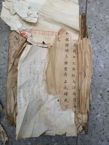 在展开梳理之时,心渐渐的静了下来,一张一张的拍了起来。在拍的时候,李三丫说,我不识字,太婆说交给我保管,不识字的人不会把东西丢掉,因为纸张记载的都是有用的东西,是家族的命根子。所以一小片纸张她都不敢扔掉。她近几年看到有人修家谱,和和睦睦,也真希望能把家谱修起来,兄弟之间团结比什么都重要。我问人丁怎么那么稀少,她回道,听前辈说,最早童家人居住在航山脚下,那个时候老虎很多,家里小孩经常被吃掉。一开始有大片的田地与山峦,因人丁稀少,能力弱小,最后一点一点被人家拿走。