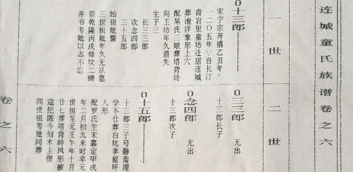 18:46随即将武夷山家谱记载从连城迁出的一页发给童杰章,让其查找,其发上连城童氏族谱卷之六(一世至十五世得祥公房,第九修)谱数页。一世十三郎(宋宁宗开禧乙丑年1205自长汀青岩里童坊迁居连城),生子三,长三三郎,次念四郎,三十五郎。本支系为三子十五郎名下的世系记载。三三郎与念四郎都没有记载,无出,按他们的家谱的意思,应该理解为没有迁出记载,信息没有了。
