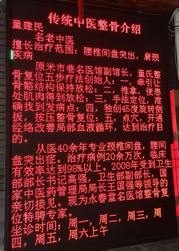 8月21日下午近六点半,在杭州上塘路190号见一显示屏,红色的特别醒目,“童建民”三个字影入眼帘,“传统中医整骨介绍”,呵呵,今天不错,看到了二位童家人的介绍了。往前走了走,后来一想还是回头看看老中医是哪里人、怎么来到杭州的?是好奇心让我回了头。